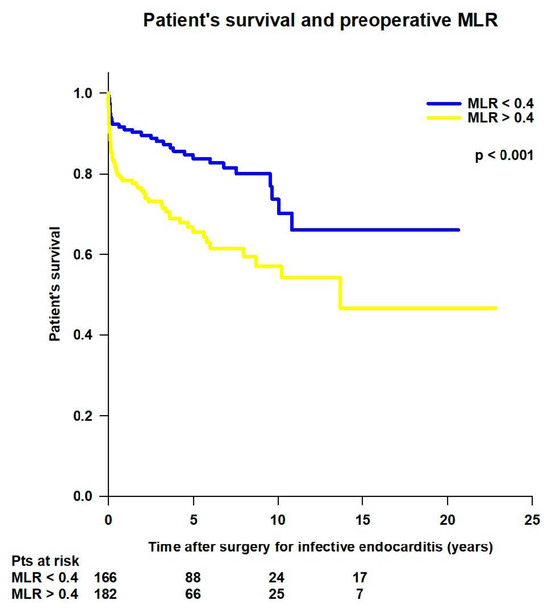 Patient’s survival after surgery for infective endocarditis, according to preoperative monocyte-to-lymphocyte ratio (MLR) value.