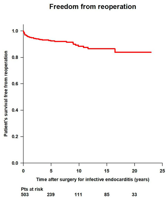 Forty (8%) patients underwent reoperation during the follow-up period, 22 (7%) patients with prior NVE and 18 (11%) with prior PVE. Indications for reintervention were recurrent IE (n = 20, 4%), homograft/prosthesis SVD (n = 5, 1%), NSVD (n = 8, 2%), and other (n = 7, 1%).