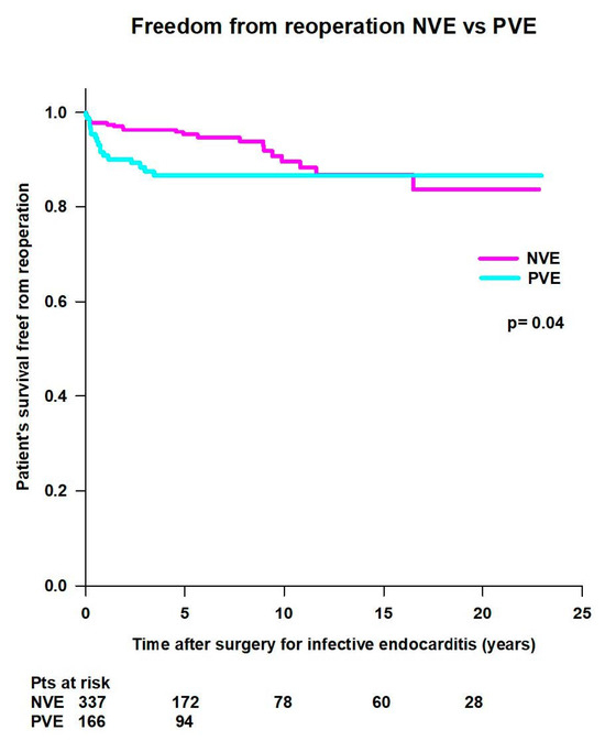 Mean survival time free from reoperation (20.5 ± 0.5 years vs. 20 ± 0.7 years; p = 0.04) and survival rates free from reoperation (99.1% at 30 days, 97.8% at 1 year, 95.2% at 5 years, 89.5% at 10 years, 86.7% at 15 years, and 83.6% at 20 years vs. 93% at 30 days, 90.8% at 1 year, and 86.5% at 5 years) were significantly better in patients with NVE compared to patients with PVE (Figure 11).