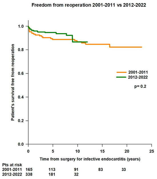 No difference was observed in in mean survival time (19.9 ± 0.6 years vs. 11.1 ± 0.2 years; p = 0.2) and survival rates free from reoperation (94% at 1 year, 88.8% at 5 years, 86.9% at 10 years, 84.8% at 15 years, and 82.3% at 20 years vs. 96.3% at 1 year, 94.7% at 5 years, and 86.7% at 10 years) between patients operated in the first period of the study (2001–2011, n = 165) and patients operated in the second period of the study (2012–2023, n = 338) (Figure 12).