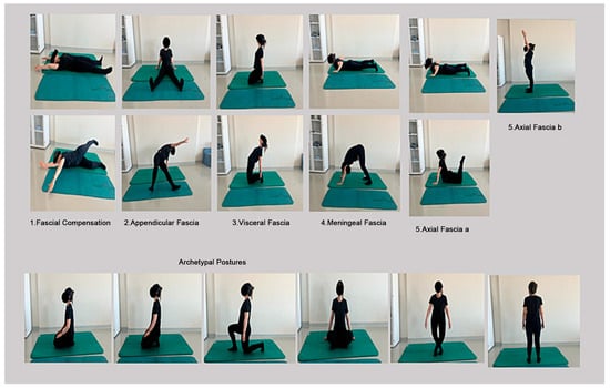 Illustration of fascial pattern exercises and archetypal postures applied during the study.