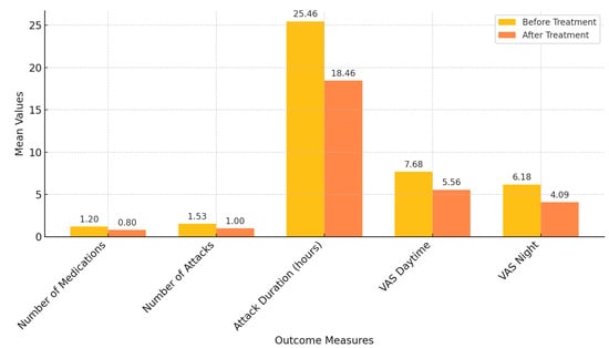This bar chart illustrates the mean values of key outcome measures, including the number of medications used per day, the number of migraine attacks, attack duration (in hours), and visual analog scale (VAS) scores for daytime and night-time pain, both before and after the intervention in the treatment group. Significant improvements were observed across all measures after the fascia exercise intervention, demonstrating its potential efficacy in reducing migraine-related symptoms. Comparison of the outcome measurements before and after treatment in the treatment group is given in Figure 3.