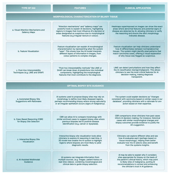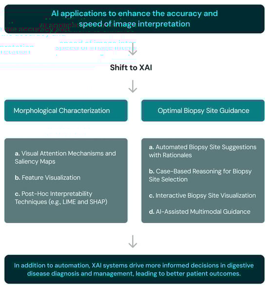 Cholangioscopy is the main technique used to diagnose malignant biliary strictures. The difficulty in interpreting subtle morphological changes in cholangioscopy sparked interest in applying XAI, specifically for “morphological characterization” and “optimal biopsy site guidance” (Figure 3) [38,39]. Subtle morphological changes help differentiate benign (inflammation or fibrosis) from malignant (cholangiocarcinoma) biliary strictures, and several XAI approaches can assist in morphological characterization. Malignant biliary strictures are diagnosed through biopsy, with accuracy dependent on selecting the optimal site. XAI can help identify the best biopsy site, enhancing diagnostic accuracy in a transparent and understandable manner. Morphological characterization can be improved through attention mechanisms, feature visualization, or post hoc interpretability techniques while guiding optimal biopsy using case-based reasoning or interactive visualization, improving diagnosis and management [21].