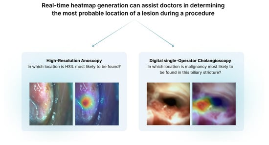 Real-time heatmap generation for lesion location and biopsy guidance in high-resolution anoscopy and digital single-operator cholangioscopy.