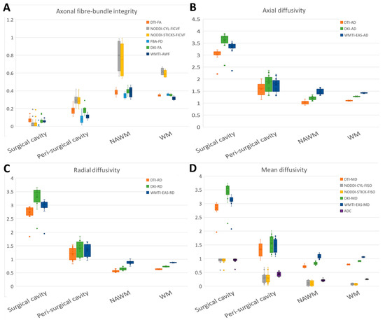 Within the surgical cavity, more than 1 year after surgery, we would expect an absence of axons due to the surgical removal of tissue, and therefore axonal fibre-bundle integrity parameters should have no values within the surgical cavity. In contrast, within intact white matter tissue, a high number of axons is expected. Therefore, the axonal fibre-bundle integrity parameters should have high values within the white matter. For axial, radial, and mean diffusivity, one would expect a different behaviour within the surgical cavity and white matter. Due to the absence of tissue, the water molecules are not restricted in their motion, and hence high AD, RD, and MD values are expected in the surgical cavity, whereas low AD, RD, and MD values are expected in the white matter, due to the high cellular density. The peri-surgical cavity is expected to be in the middle, as the edema observed with T2w-FLAIR decreases the cellular density.