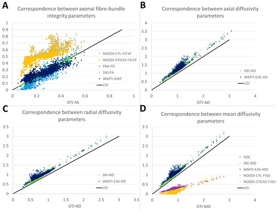 Correspondence assessment between the various DWI-derived parameters. WMTI-IAS-Da is excluded from the images due to the extremely different values for axonal fibre-bundle integrity, and can be found in Supplementary Figure S3. For abbreviations, see Figure 2.