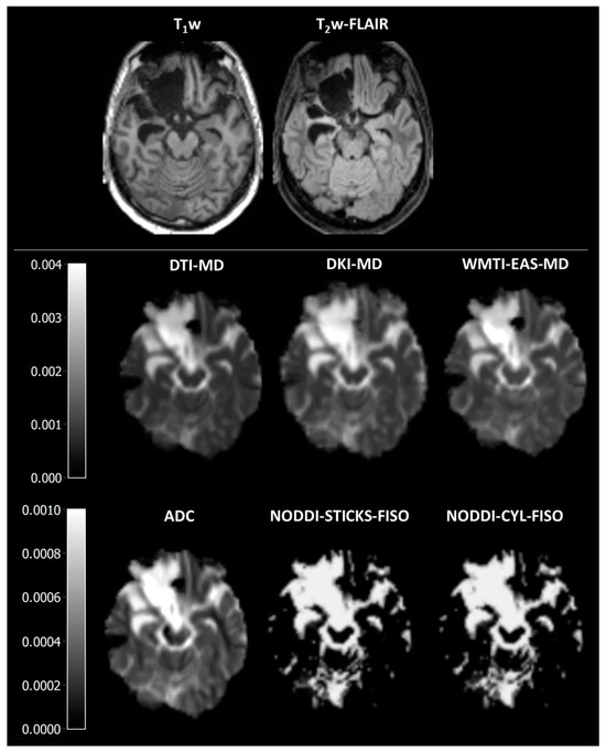 Representative images of mean diffusivity-related parameters. DTI-MD is the mean diffusivity as estimated using diffusion tensor imaging, DKI-MD is the mean diffusivity as estimated using diffusion kurtosis imaging, WMTI-EAS-MD is the extra-axonal space mean diffusivity as estimated using white matter tract integrity, ADC is the apparent diffusion coefficient, NODDI-STICKS-FISO is the isotropic volume fraction as estimated using neurite orientation dispersion and density imaging with the sticks model for neurites, and NODDI-CYL-FISO is the isotropic volume fraction as estimated using neurite orientation dispersion and density imaging with the cylinder model for neurites.
