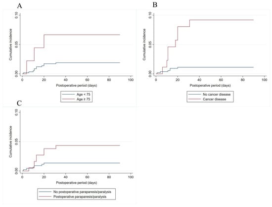 Risk of developing ninety-day post-operative VTE when patients were classified according to age (A), cancer (B) and postoperative paraparesis/paralysis status (C).