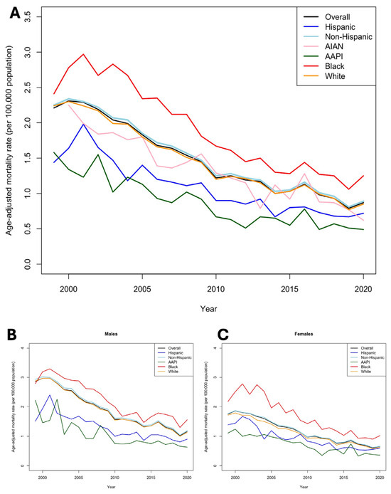 The following supporting information can be downloaded at https://www.mdpi.com/article/10.3390/jcm14020562/s1, Table S1: Age-adjusted mortality rates stratified by sex and ethnicity, 1999–2020. Table S2: Age-adjusted mortality rates stratified by age and ethnicity, 1999–2020. Table S3: Age-adjusted mortality rates stratified by the US census regions and ethnicity, 1999–2020.