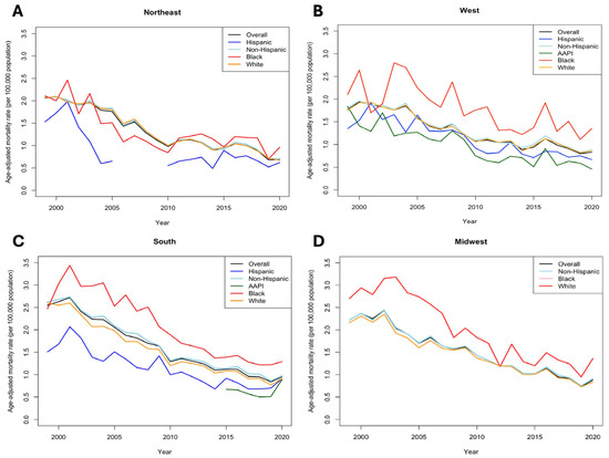 Trends in age-adjusted mortality (per 100,000) between race/ethnicity stratified by US census regions. (A), Northeast. (B), West. (C), South. (D), Midwest.