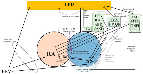 - Dawson, T.M.; Starkebaum, G.; Wood, B.L.; Willkens, R.F.; Gown, A.M. Epstein-Barr virus, methotrexate, and lymphoma in patients with rheumatoid arthritis and primary Sjögren’s syndrome: Case series. J. Rheumatol. 2001, 28, 47–53. [Google Scholar]