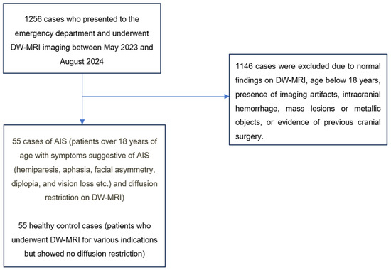 A total of 1256 patients with DW-MRI images recorded in our hospital’s information management system between May 2024 and September 2024 were retrospectively analyzed. These patients underwent systematic evaluation. Accordingly, patients over 18 years of age who presented to the emergency department with neurological symptoms suggestive of AIS (hemiparesis, aphasia, facial asymmetry, diplopia, and vision loss) and underwent DW-MRI on the same day with preliminary diagnosis of AIS were identified. Among the screened patients, 55 cases with diffusion restriction on DW-MRI were classified as the AIS group (Figure 1). Cases with clinical findings but no diffusion restriction on DW-MRI were not included in the AIS group (Figure 1).