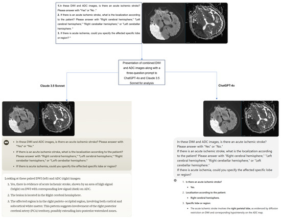 The original Digital Imaging and Communications in Medicine (DICOM) format DWI and ADC images of the cases were first anonymized using AW Volumeshare 7 software (AW version 4.7, GE Healthcare, Milwaukee, WI, USA). Subsequently, the images were converted to JPEG format through this software without altering basic parameters such as resolution, brightness, and contrast. All images were exported while preserving the original pixel size. During conversion, high-level JPEG quality was preferred to preserve diagnostically important details as much as possible. Later, DWI and ADC images were combined into a single image using Microsoft Paint software (Microsoft, Corp., Redmond, WA, USA), and irrelevant regions outside the brain were cropped from the newly created image. Additionally, orientation verification was performed by radiologists on the images before uploading them to the models. To minimize bias, the cases were presented to the models in a randomized order, accompanied by the three-question prompt mentioned earlier. The responses provided by the models were recorded (Figure 2). Additionally, to assess intra-model reliability, all cases were reanalyzed with the same models two weeks later.