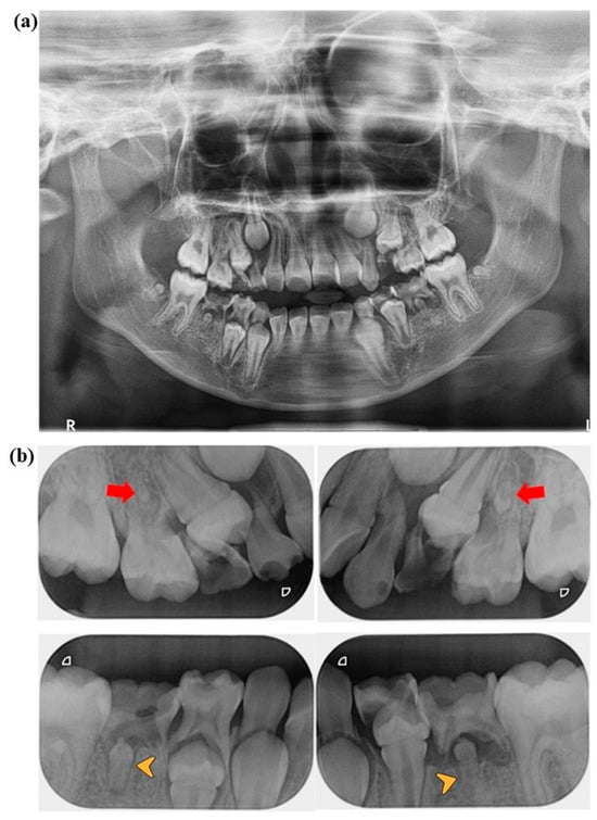 (a) Panoramic radiograph and (b) periapical radiographs were taken of the 7-year and 4-month-old patient (first visit). The film shows the patient’s primary teeth with a decayed-missing-filled-teeth index (DMFT) of 10. (b) The red arrows show rudimentary formations on tooth numbers 15 and 25. The yellow arrow heads show microdontia on tooth numbers 35 and 45.