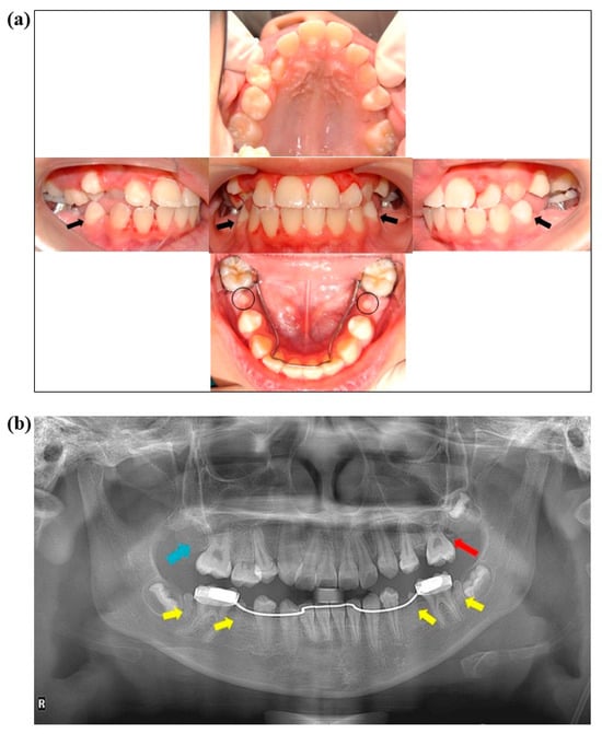 These images were taken of the patient at age 12, five years after completing dental treatment. (a) Intraoral pictures show microdontia on tooth numbers 35 and 45 (black circles). Black arrows show the cervical line on the enamel of tooth numbers 34 and 44 (chronological hypoplasia). A lingual holding arch was placed on the lower arch to prevent mesial shift of tooth numbers 36 and 46. (b) This panoramic radiograph was taken after the completion of dental treatment. It shows a DMFT of 0 on permanent teeth. The yellow arrows show microdontia on tooth numbers 35, 37, 45, and 47. The blue arrow shows where tooth number 17 is missing, and the red arrow shows a minor calcification mass on tooth number 27.
