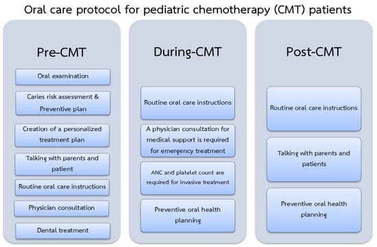 The oral care protocol for CMT patients can be divided into 3 periods: Pre-CMT, During-CMT, and Post-CMT (Figure 3).