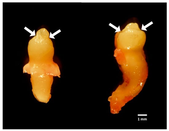 The gross anatomy of microdontia on tooth numbers 45 and 47 (tooth height < 50% of expected size). White arrows showed the line on enamel (chronological hypoplasia). Scale bar = 1 mm.