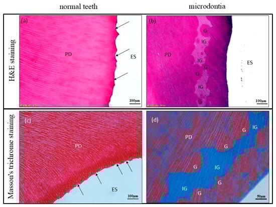 (a,c) A decalcified section of a normal tooth (control) shows normal primary dentin lining near the scalloped dentinoenamel junction (DEJ: black arrows), (a) was stained with H&E, (c) was stained with Masson’s trichrome. Scale bar = 100 μm. (b) Microdontia shows decreased mineralization in primary dentin, indicating a large region of interglobular dentin (IG: pale pink area), surrounded by globular dentin (G: dark pink area) (H&E; Scale bar = 100 μm). (d) Microdontia shows decreased mineralization in primary dentin indicating a large region of interglobular dentin (blue area), surrounded by globular dentin (red area) (Masson’s trichrome staining; Scale bar = 50 μm). ES = Enamel space, G = globular dentin, IG = interglobular dentin, PD = primary dentin.