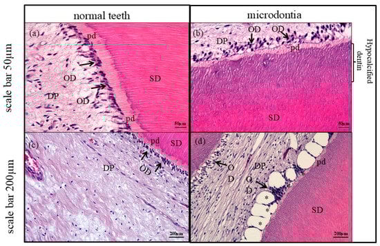 (a,c) A normal tooth (control) shows normal secondary dentin (SD) lining nearby pulpal tissue (DP) with normal pre-dentin (pd) (newly formed dentin before mineralization) secreted by healthy odontoblasts (OD: arrow), H&E. (a) has a scale bar = 50 μm, (c) has a scale bar = 200 μm. (b) Microdontia tooth displayed a decrease in the odontoblast cells (OD: arrow) lining with irregularity of dentinal tubules with thinning of pre-dentin (pd) product, compared to those found in the control. Additionally, mature dentin bound by pre-dentin showed lower calcification product than those of normal dentin, H&E. Scale bar = 50 μm. (d) Vinblastine chemotherapy induced disorganized odontoblast cells and dental pulp edema (asterisk) in microdontia, H&E. Scale bar = 200 μm.