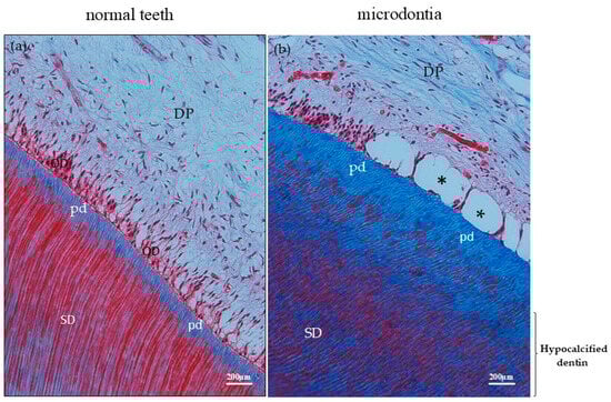 (a) Decalcified section of a normal tooth (control) shows normal secondary dentin lining. (b) Mature dentin bound by pre-dentin shows less calcification product than normal dentin as well as a lower number of odontoblast cells, and dental edema (asterisk). Masson’s trichrome staining. Scale bar = 200 μm. DP = dental pulp, SD = secondary dentin, pd = pre-dentin, asterisk = dental pulp edema.