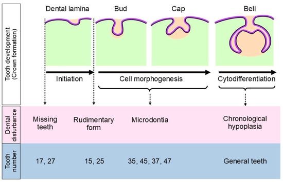 A distinctive band of enamel structures on the buccal surface of the patient’s first premolars (Figure 2a: black arrows) is likely related to high fever that she experienced after the first cycle of CMT. This high fever can be referred to as febrile neutropenia [], and it is the most common complication following CMT []. Ameloblastic cells are sensitive to environmental changes, and they can die. In this patient, enamel formation was disrupted in all teeth, including those with microdontia. The exact effects depend on the timing and duration of the high fever, a situation which is called chronological hypoplasia. After recovery from the high fever, it is possible for enamel formation to return to normal [,,]. In this case, the high fever affected the late bell stage or the cytodifferentiation stage (Figure 8). Chronological hypoplasia can increase the risk of dental caries with or without affecting esthetics. Therefore, dental management, including careful discussions with parents/caretakers about routine oral care and adherence to the “oral care protocol” outlined above, is very important for increasing quality of life for patients.