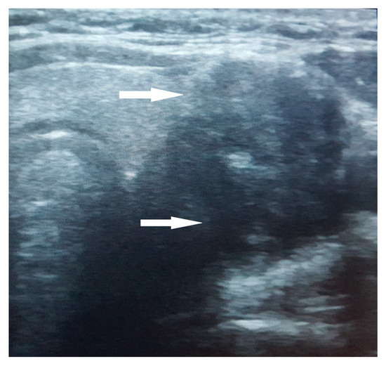 Examination of the anterior cervical region revealed a 5 × 3 cm soft, irregular, non-tender mass with ill-defined margins on the left side of the neck. The mass moved with swallowing and was localized at the thyroid lodge without any associated cervical adenopathy. The cervical perimeter (36 cm) was increased compared to the normal value for her age and sex [9,10]. No symptoms of pain, loss of appetite, swallowing, or mastication disturbance, or symptoms suggestive of thyroid pathology, were reported, and carotid pulsation was palpable.