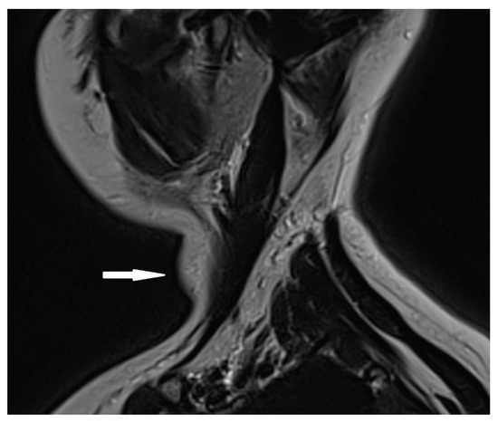 Cervical MRI with gadolinium contrast showing a gadolinium-avid tumor (arrow) located posteriorly to the left thyroid lobe.