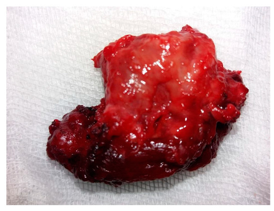 A tumor exhibiting increased consistency was surgically removed, along with the entire thyroid lobe. The mass was firmly adhered to the adjacent tissues. Sectioning the isthmus and separating the left thyroid lobe from the trachea and thyroid cartilage proved challenging. Consequently, a left lobectomy was performed with adequate local hemostasis. No evidence of adenopathy was observed in the left lateral cervical compartment. On macroscopic histopathological examination, the thyroid specimen measured 4.1 × 2.6 × 1.2 cm and exhibited a brown-pink color with an irregular shape, elastic consistency, and a smooth surface upon palpation. The tumor (Figure 3) was distorted and contained in the left lobectomy specimen, situated in the lower external third, with dimensions of 1.8 × 1.6 × 1.3 cm. It displayed a brown-mahogany coloration reminiscent of coffee, an irregular shape, and a firm consistency compared to the surrounding normal thyroid tissue. Superficially, the tumor exhibited multiple irregular peripheral brown streaks, creating a striped appearance that converged and aligned with the adjacent thyroid tissue.