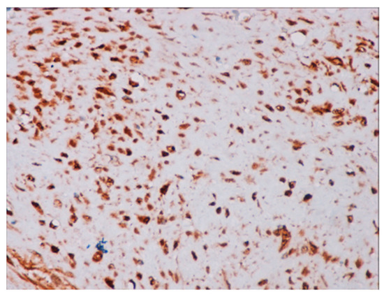 Immunohistochemical studies demonstrated that the cells showed zonal expression for smooth muscle actin (BD Biosciences (Franklin Lakes, NJ, USA)), desmin (BD Biosciences, clone D33, 610711), and vimentin (BD Biosciences, clone V9, 550513) (Figure 5), and stained nuclear and cytoplasmic with β-catenin (BD Biosciences, clone 14, 610153) (Figure 6), but were negative for pan-cytokeratin, CD34 and S-100. The tumor proliferation index Ki-67 (BD Biosciences, clone B56, 556003) was 5% in the areas with the highest proliferation. Mast cells are positive for C-Kit and were distributed along the blood vessels, while the inflammatory infiltration was located between the lesion and the surrounding adjacent soft tissues (Figure 7).