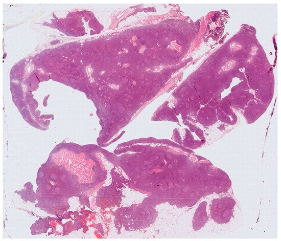 Differential diagnosis cannot fail to consider thymic hyperplasia with lymphoid epithelial sialadenitis (LESA)-like features (LESA-like TH) [,]. This pathological entity presents a strong association with lymphomas and non-myasthenic autoimmune diseases, as stated by the authors. LESA-like TH is described as a tumorous proliferation, unlike MTC, and it is characterized by lymphoepithelial lesions, Hassall corpuscles with cystic changes, cortical atrophy, and lymphofollicular hyperplasia. In this disease, the appearance is compared to a lymph node with various cystic components, while in MTC, the cystic aspect is predominant in macroscopic and microscopic appearance; LESA-like TH might be diagnosed as a cystic lesion of the thymus because of a massive cystic prevalence appearance. It is undeniable that there might be some diagnostic overlap, especially because of the association that both diseases have with lymphoma and autoimmune diseases. Further investigations are needed to clarify the origin of these two benign lesions, including immunohistochemistry and embryological study.