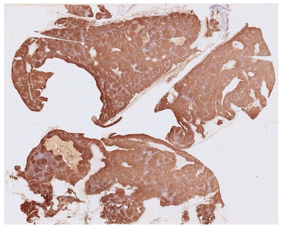 Histology showed an MTC lined by cubic epithelium and rich in lymphoid tissue, organized in germinal centers (CD10+, BCL6+, BCL2−, CD21+, CD23+), and a mantel zone (CD79A+, BCL2+), the interfollicular region represented by T-cell (CD3+), and occasional Hassall’s Corpuscles (Figure 2, Figure 3 and Figure 4).