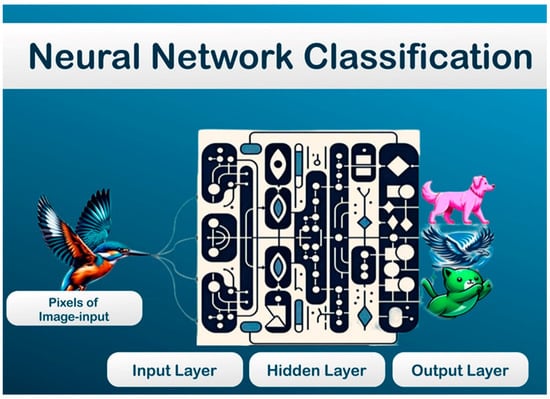 Illustration of a neural network classifying an image, with pixels as input, processed through multiple hidden layers, and resulting in classification outputs for categories like dog, bird, and cat.