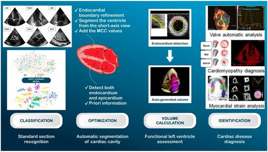 - Asch, F.M.; Poilvert, N.; Abraham, T.; Jankowski, M.; Cleve, J.; Adams, M.; Romano, N.; Hong, H.; Mor-Avi, V.; Martin, R.P.; et al. Automated Echocardiographic Quantification of Left Ventricular Ejection Fraction Without Volume Measurements Using a ML Algorithm Mimicking a Human Expert. Circ. Cardiovasc. Imaging 2019, 12, e009303. [Google Scholar] [CrossRef] [PubMed] [PubMed Central]