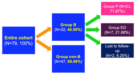 | Parameter | Descriptive Statistics (Units) | Entire Sample (N = 79, 100%) | Group B (N = 32, 40.51%) | Group Non-B (N = 47, 59.49%) | p-Value |