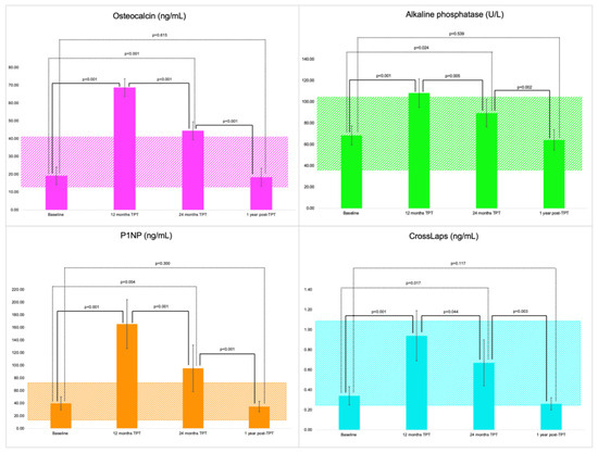 - Chen, F.P.; Fu, T.S.; Lin, Y.C.; Sung, C.M.; Huang, M.H.; Lin, Y.J. Association between P1NP and bone strength in postmenopausal women treated with teriparatide. Taiwan. J. Obs. Gynecol. 2022, 61, 91–95. [Google Scholar] [CrossRef] [PubMed]