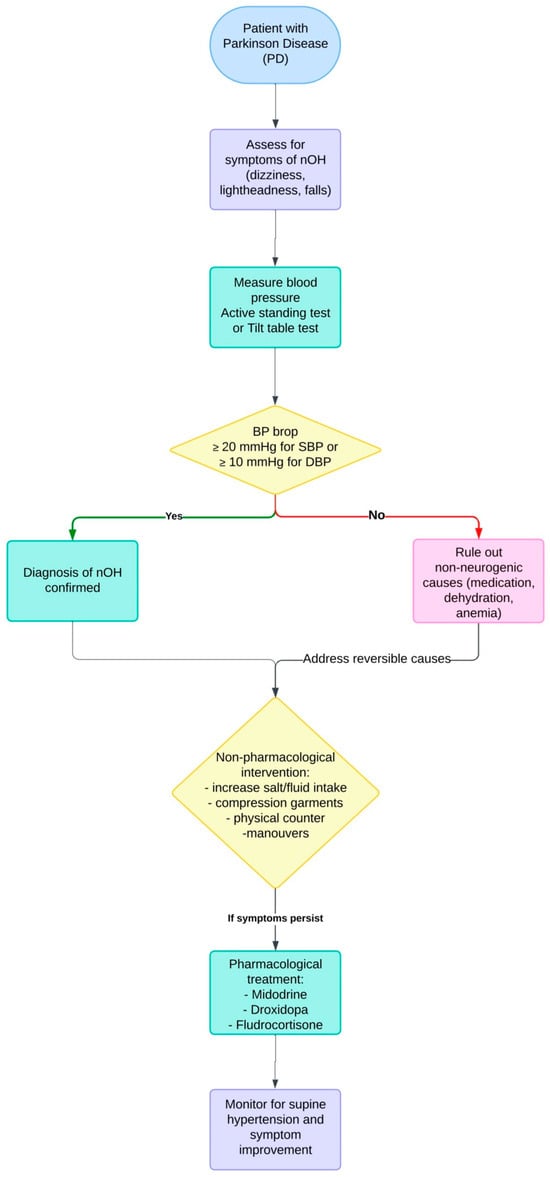 In summary, pharmacological treatments play an essential role in managing orthostatic hypotension, helping to stabilize blood pressure and alleviate symptoms. However, careful monitoring is necessary to minimize potential side effects, such as supine hypertension and cardiovascular complications. These treatments should be part of a comprehensive approach that also includes patient education and non-pharmacological strategies to optimize outcomes and improve the overall quality of life for PD patients experiencing OH.