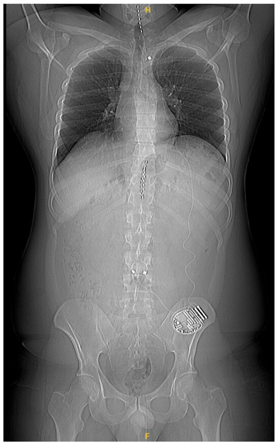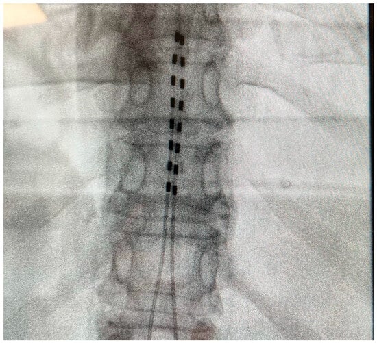 Patients were implanted with epidural percutaneous leads targeting the lower extremities (T10–T11), and upper extremities (C4–C7) if necessary, and with an implantable pulse generator (IPG) system (Alpha WaveWriterTM, Boston Scientific Corporation, Valencia, CA, USA) (Figure 1). The implantation procedure and criteria for permanent implants were based on established standards and were performed in accordance with the center’s standard practice (pain relief ≥ 50% based on a trial phase).