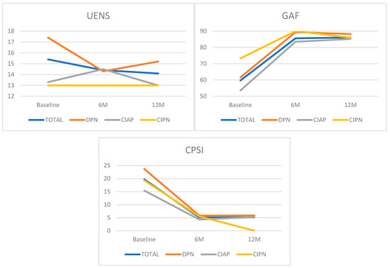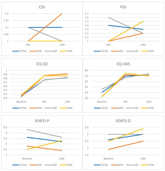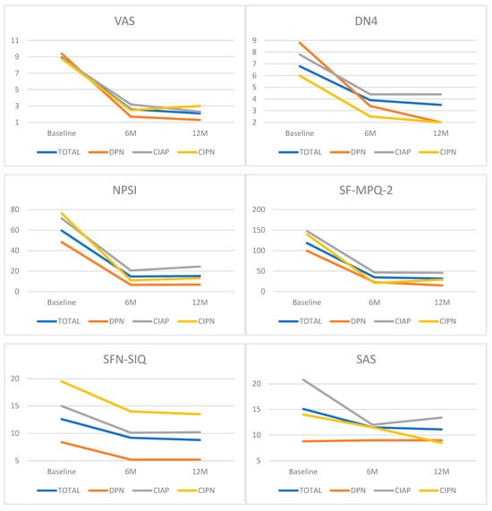 Clinical assessment outcome measurements at baseline and 6 and 12 months by etiology. For all outcomes, the point of measurement of the outcome is represented on the X-axis and the outcome score (points) is shown on the Y-axis. VAS: visual analog scale; DN4: Douleur Neuropathique-4; NPSI: Neuropathic Pain Symptom Inventory; SF-MPQ-2: short-form McGill Pain Questionnaire 2; SFN-SIQ: Small Fiber Neuropathy Symptom Inventory Questionnaire; SAS: Survey for Autonomic Symptoms; UENS: Utah Early Neuropathy Scale; GAF: Global Assessment of Functioning; CPSI-SPI: Chronic Pain Sleep Inventory Sleep Problem Index; CGI: Clinician Global Impression of Change; PGI: Patient Global Impression of Change; EQ-5D: five-level EuroQol Five-Dimension descriptive system; EQ VAS: five-level EuroQol Five-Dimension visual analog scale; IENFD-P: proximal intra-epidermal nerve fiber density; IENFD-D: distal intra-epidermal nerve fiber density. DPN: diabetic chronic polyneuropathy; CIAP: chronic idiopathic axonal polyneuropathy; CIPN: chemotherapy-induced chronic polyneuropathy.