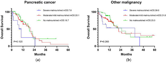 Long-term OS curves in patients based on GNRI-defined malnutrition categories are summarized in Figure 2. The median OS months following pancreatoduodenectomy in patients with pancreatic cancer in the GNRI severely malnourished, moderately/mildly malnourished, and no malnourishment groups were 7.8, 20.1, and 18.7 (Figure 2a). The median OS months following pancreatoduodenectomy in other malignancy patients in the GNRI severely malnourished, moderately/mildly malnourished, and no malnourishment groups were 39, 21.8, and 25.0 (Figure 2b). When identified as a prognosis variable, GNRI severe malnourishment did not predict OS in pancreatic cancer patients following pancreatoduodenectomy (p = 0.120). Similarly, the OS rate was not significantly different between other malignancy patients with or without GNRI severe malnourishment (p = 0.265).
