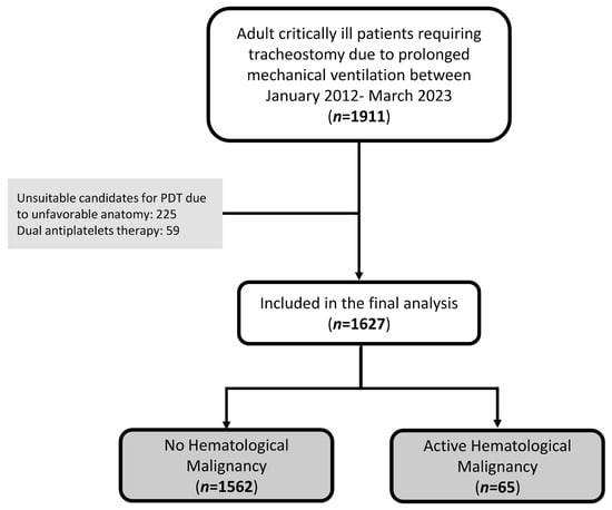 During the study period, a total of 1911 patients required tracheostomy due to prolonged mechanical ventilation. Two hundred and twenty-five patients (11.8%) were deemed unsuitable candidates for PDT due to unfavorable anatomy identified during the initial clinical evaluation, such as having thick, short necks; morbid obesity; cervical tumor; or goiter. These patients underwent surgical tracheostomy. An additional total of 59 patients (3.1%) were excluded due to dual antiplatelet therapy. A total of 1627 patients were included in the analysis, of whom 65 (4.0%) had active HM, while 1562 (96.0%) comprised the control group (Figure 1).