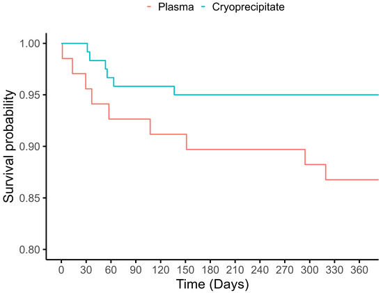 Results: Of 189 patients meeting inclusion criteria, 120 received cryoprecipitate, and 69 received plasma as the first product after PRBCs. In the univariable analysis, the cryoprecipitate group had lower 1-year mortality (5.0% vs. 14.5%; [95% CI]: 0.31 [0.10, 0.88],