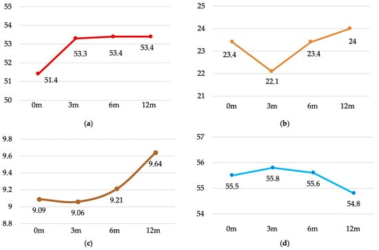 Muscle mass followed an initial increase at 3 months, stabilising thereafter. Differences were significant across all time points (F(2,62) = 13.56, p < 0.001, η2 = 0.109), with post hoc tests confirming changes from baseline to 3, 6 and 12 months (all p < 0.001) (Figure 1a). Fat mass decreased during the first three months and then slightly increased between months 6 and 12. Overall differences were significant (F(2,64) = 4.97, p = 0.004, η2 = 0.043), with post hoc comparisons revealing changes from 3 to 6 months (−1.32%, p = 0.013) and from 3 to 12 months (−1.97%, p = 0.001) (Figure 1b). Visceral fat decreased slightly at 3 months and then increased over the following months (F(2,71) = 3.38, p = 0.023, η2 = 0.013). Significant changes were observed between 3 and 12 months (−0.58, p = 0.024) (Figure 1c). Total body water showed a modest increase at 3 months, followed by a gradual decline to below baseline values by 12 months, although these differences did not reach statistical significance (F(2,69) = 1.61, p = 0.190) (Figure 1d).
