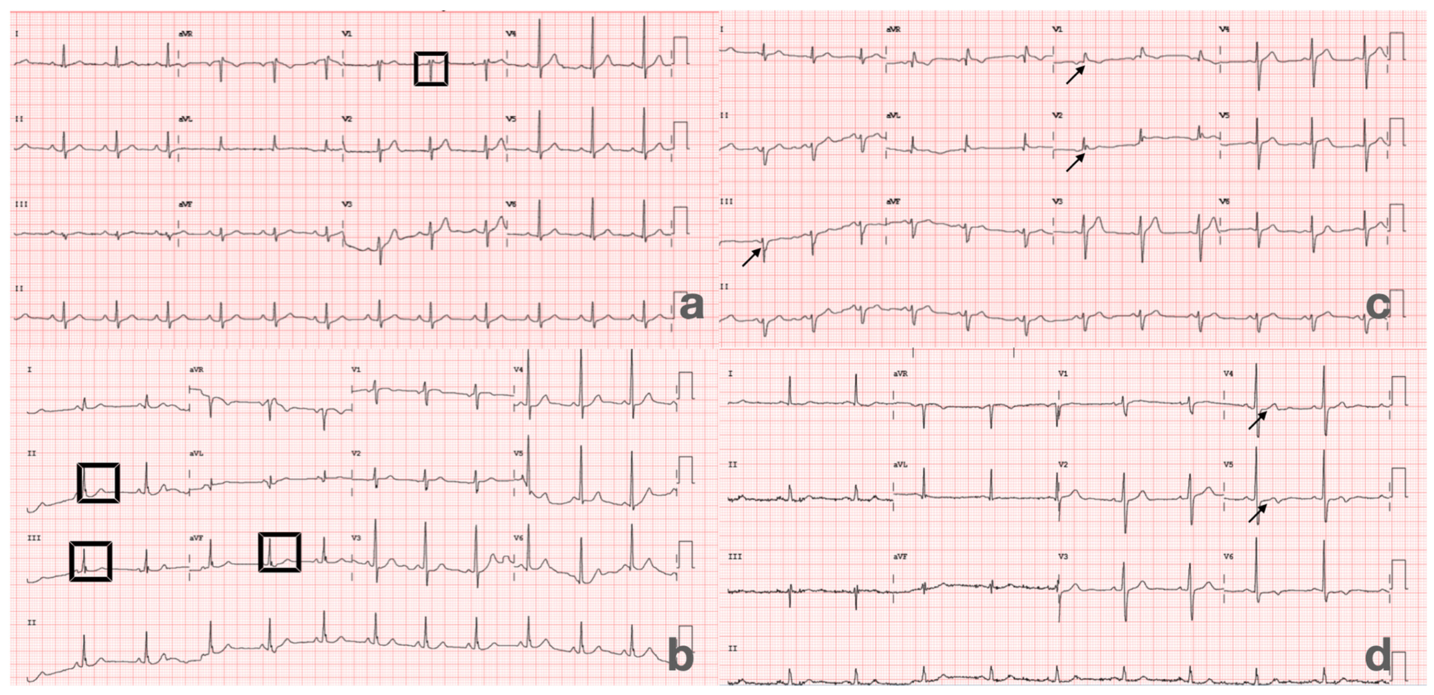- Belvís, R.; Leta, R.G.; Martínez-Domeño, A.; Planas, F.; Martí-Fàbregas, J.; Carreras, F.; Cocho, D.; Pons-Lladó, G.; Martí-Vilalta, J.L.; Luna, A.B. Electrocardiographic findings in patients with cryptogenic ischemic stroke and patent foramen ovale. J. Electrocardiol. 2007, 40, 168–171. [Google Scholar] [CrossRef]