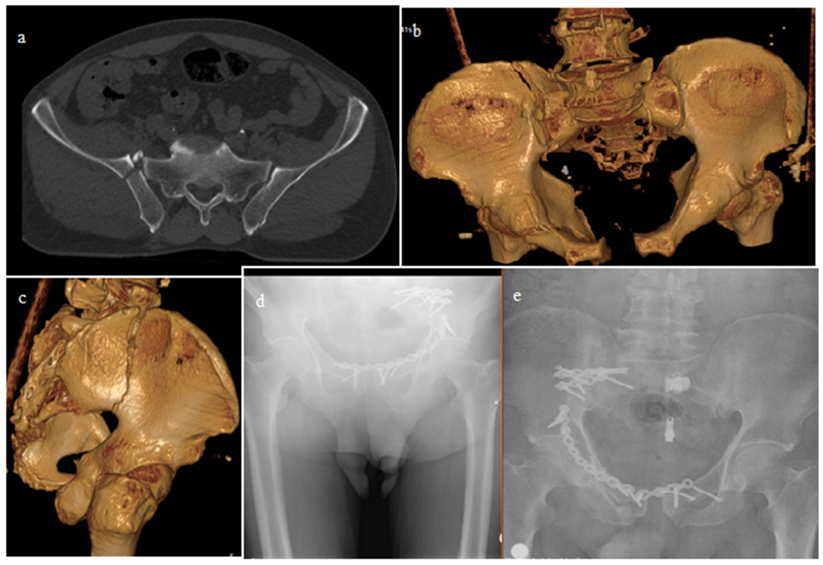- Burgess, A.R.; Eastridge, B.J.; Young, J.W.; Ellison, T.S.; Ellison, P.S., Jr.; Poka, A.; Bathon, G.H.; Brumback, R.J. Pelvic ring disruptions: Effective classification system and treatment protocols. J. Trauma 1990, 30, 848–856. [Google Scholar] [CrossRef]