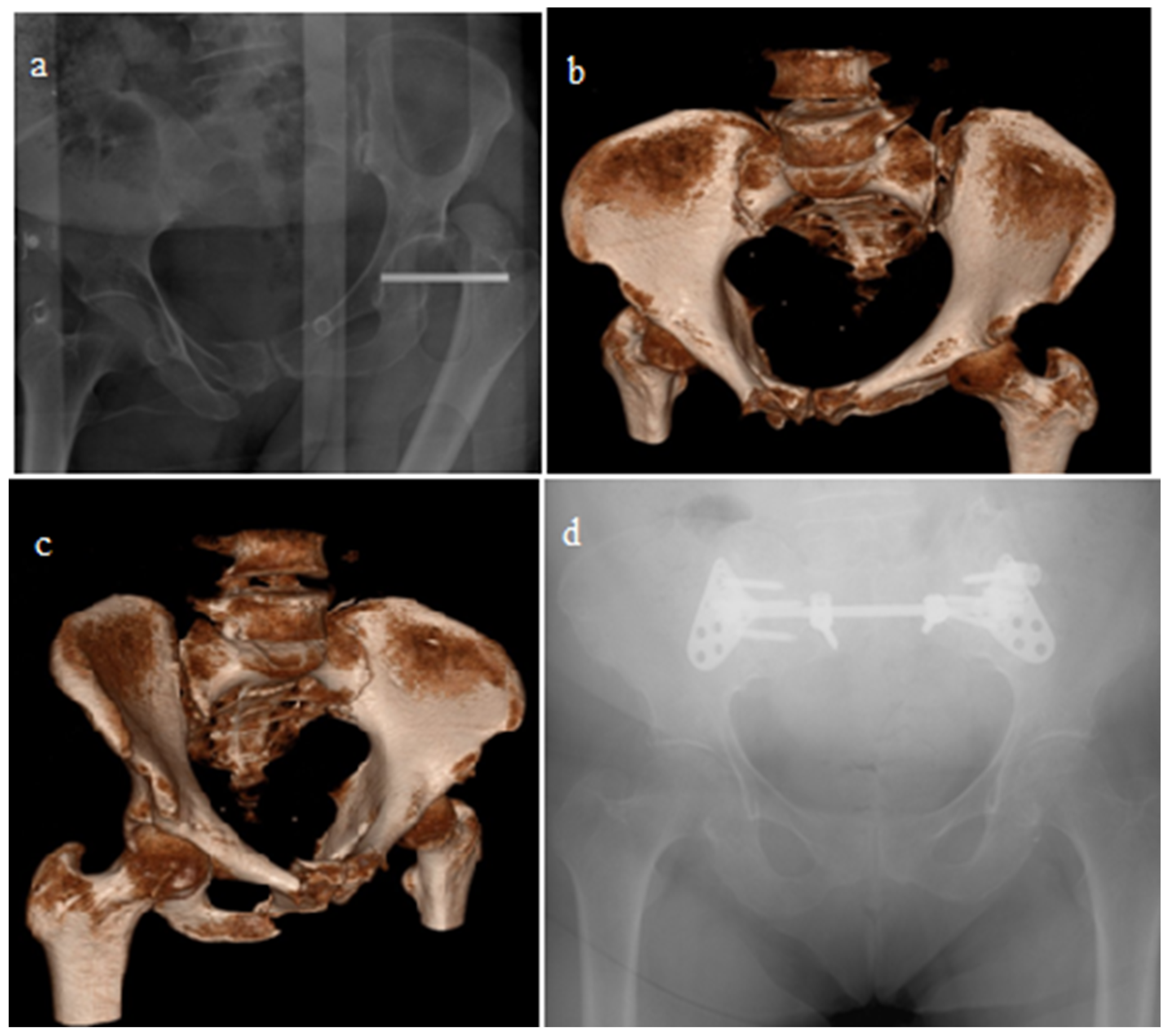 - Fan, X.H.; Zhen, P.; Gao, M.X.; Wang, J.J.; Xue, Y.; Li, M.; Deng, X.W.; Li, X.S. Characteristics of treating dislocation and fracture of sacroiliac joint through anterior and posterior approches. Zhongguo Gu Shang 2013, 26, 1048–1051. [Google Scholar]