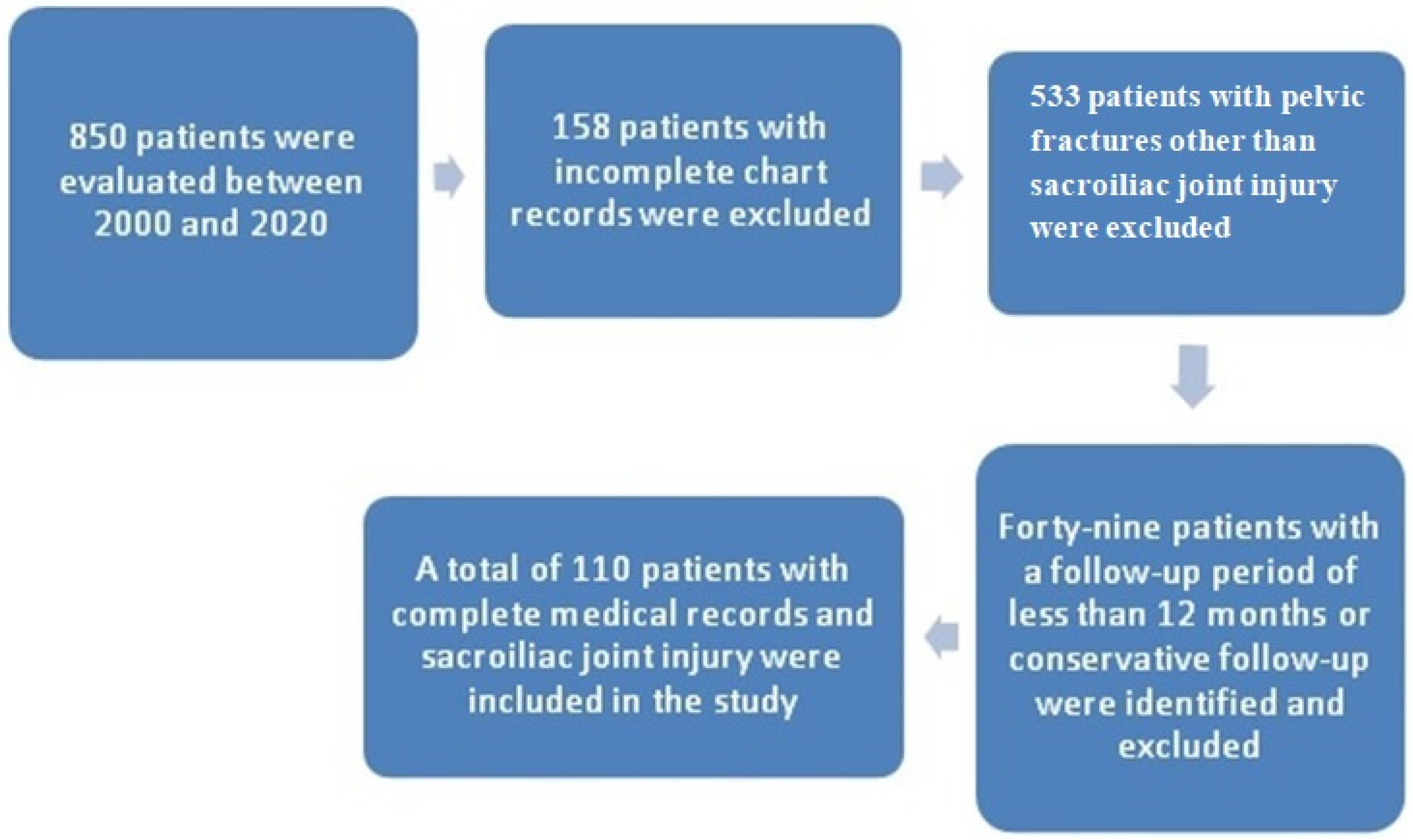 - Jatoi, A.; Sahito, B.; Kumar, D.; Rajput, N.H.; Ali, M. Fixation of Crescent Pelvic Fracture in a Tertiary Care Hospital: A Steep Learning Curve. Cureus 2019, 11, e5614. [Google Scholar] [CrossRef]