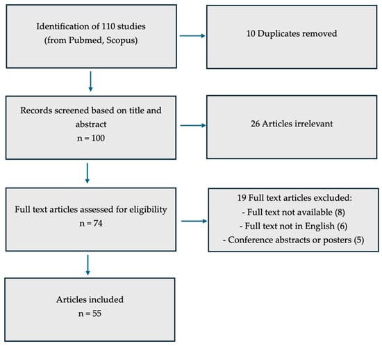 In total, 110 studies were retrieved from PubMed and Scopus. After eliminating 10 duplicates, 100 records were screened by title and abstract, leading to the exclusion of 26 articles considered irrelevant. Of the remaining 74 potentially eligible studies, 19 were removed for the following reasons: eight lacked full-text availability, six were not published in English, and five were conference abstracts or posters. Consequently, 55 studies were ultimately included in this review (Figure 1).