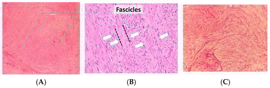 (A) Classic leiomyoma. Well-circumscribed nodule composed of intersecting smooth-muscle fascicles; bland spindle cells with elongated nuclei and inconspicuous nucleoli; minimal atypia and low mitotic activity. (B) Leiomyoma showing fascicular growth. The white arrows indicate the fascicles of smooth-muscle cells, arranged in parallel and intersecting bundles, highlighting the typical whorled architecture of the tumor; no coagulative tumor cell necrosis is observed. (C) Smooth-muscle bundles separated by collagen; special stain emphasizes extracellular matrix content typical of some fibroids [].