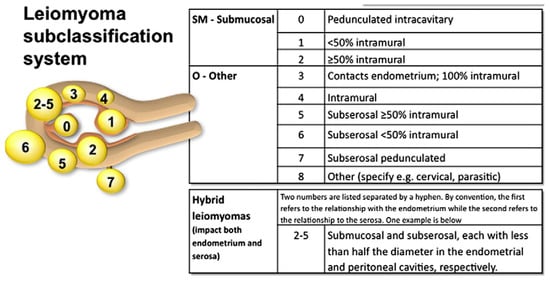 - Bajaj, S.; Gopal, N.; Clingan, M.J.; Bhatt, S. A pictorial review of ultrasonography of the FIGO classification for uterine leiomyomas. Abdom. Radiol. 2022, 47, 341–351. [Google Scholar] [CrossRef]