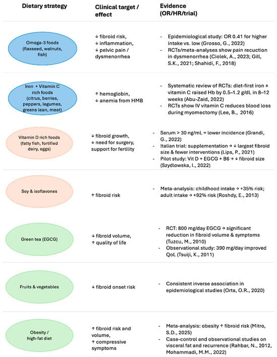 In line with the pathogenic mechanisms outlined above, two main clinical profiles can be distinguished. Younger patients frequently present with multiple uterine fibroids, a condition in which genetic predisposition appears to be the predominant determinant. In contrast, older women more commonly develop solitary fibroids, in which environmental influences—particularly those leading to exogenous and/or endogenous hyperestrogenism—may exert a decisive role. From a clinical management perspective, these distinctions are relevant, as they suggest that therapeutic strategies may need to be tailored according to the underlying etiological profile []. In both scenarios, nutritional interventions represent a promising complementary approach. While diet cannot replace pharmacological or surgical treatments, it may modulate hormonal balance, reduce symptom burden, and possibly attenuate disease progression []. The degree of benefit is likely to vary depending on whether genetic or environmental factors predominate, but incorporating nutrition into a broader, multidisciplinary management strategy could provide additional advantages in improving quality of life and overall outcomes for patients with uterine fibroids [,].